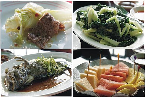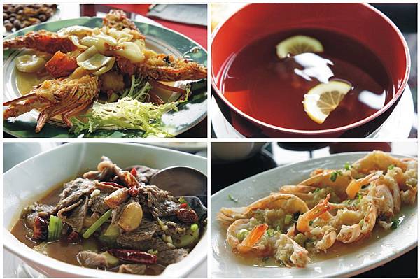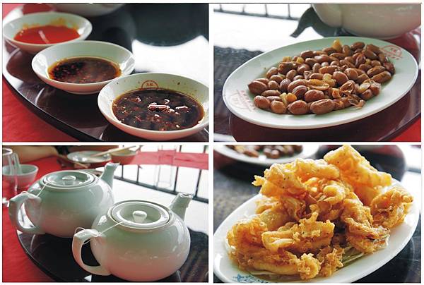 左上橘色小碟我以為是辣油,結果是甜甜酸酸醬汁,左下一壺茶水,一壺白開水