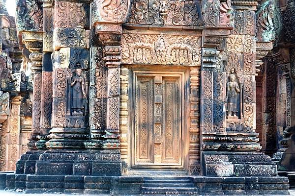 由於建造此座古剎的石頭為美麗的粉紅色,此廟壁畫的雕刻是所有吳哥古蹟中最精緻細美的