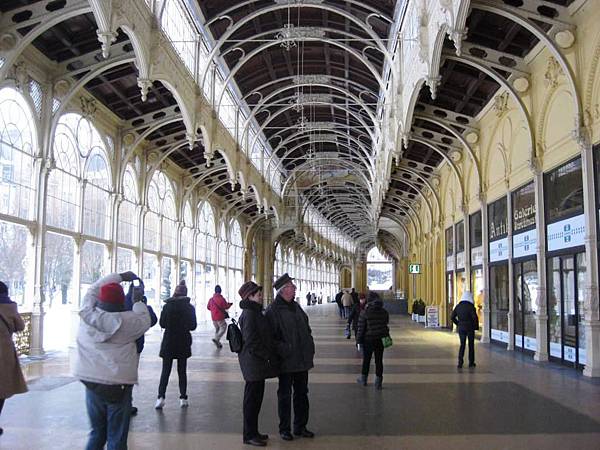 在這條長廊中可一邊飲用溫泉水,一邊散步,一旁還有咖啡廳和購物中心可逛