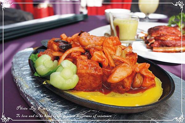 鐵板豆腐,豆腐裡面是黃色的雞蛋豆腐,這道菜超好吃 !