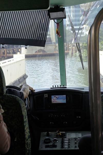 駕駛的右手會從本來握方向盤改成操作中央的控制板,所以鴨子船的駕駛不只要會開車也要能開船