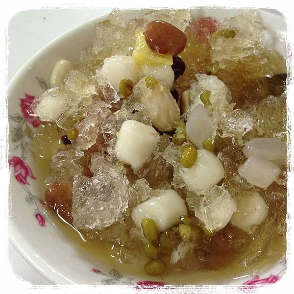 八寶有: 紅豆、綠豆、花生、大豆、鳳梨、地瓜、小湯圓跟透明的圓仔