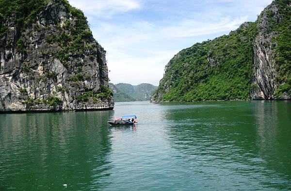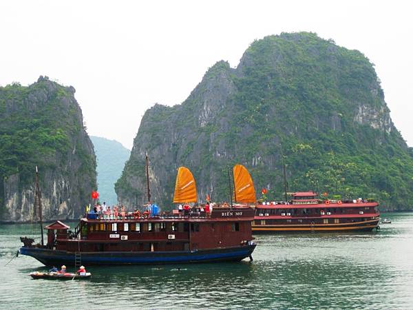 越南萬門漁村的悠久歷史、美麗景觀和下龍灣上的許多巍巍挺立石灰山圍繞著