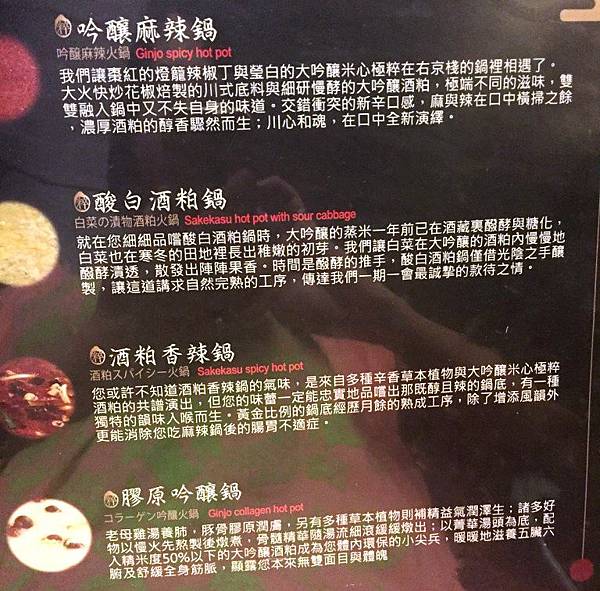 主打四種鍋底,分別是吟釀麻辣鍋、酸白酒粕鍋、酒粕香辣鍋、膠原吟釀鍋