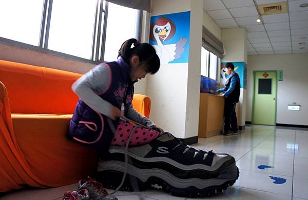 巨無霸運動鞋,這位Ann小妞在幫忙綁鞋帶