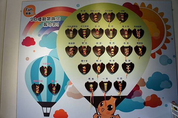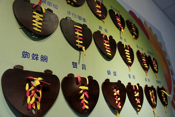 鞋寶觀光工廠26種鞋帶綁法報你知,一旁有鞋帶可以供遊客照著綁法練習綁