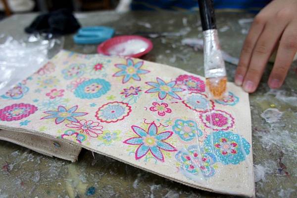 塗專用膠水在包包上,貼上剪好圖案