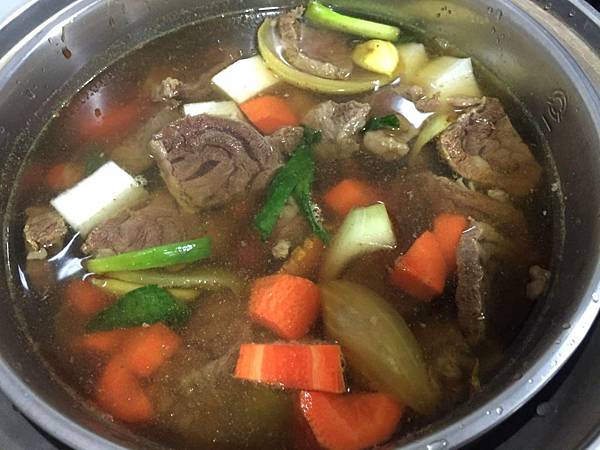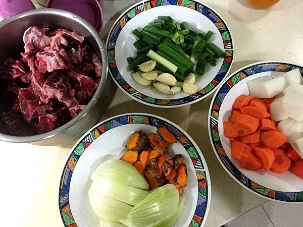 食材: 牛腱肉、紅蘿蔔、洋蔥、蔥、老薑、蒜頭、醬油一碗、米酒半碗、
