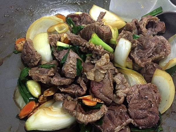 5.川燙過的牛肉放入炒一炒,再加另外醬油半碗⋯加米酒,炒一炒