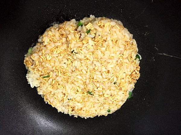 白飯、泡麵壓碎、雞蛋、蔥花、日式醬油,全部扮在一起