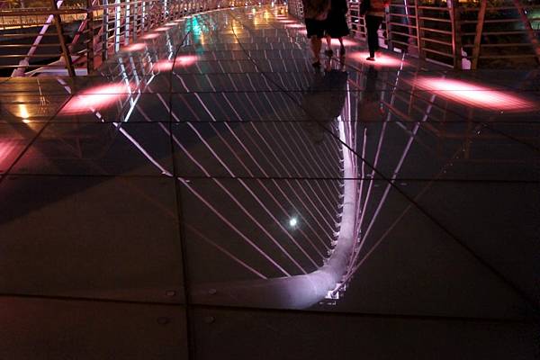 燈光照射在橋面,粉紅色的橋體馬上變得非常亮眼,橋面上的燈會閃著不一樣的顏色,非常特別!