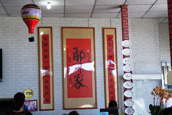 在櫃台旁,牆上掛著許多名人簽名的碗盤
