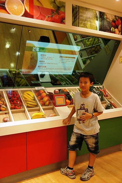 可以選擇喜愛的食物放置於一旁的磅秤上,就會顯示食物上所含的營養成分及對身體的效用