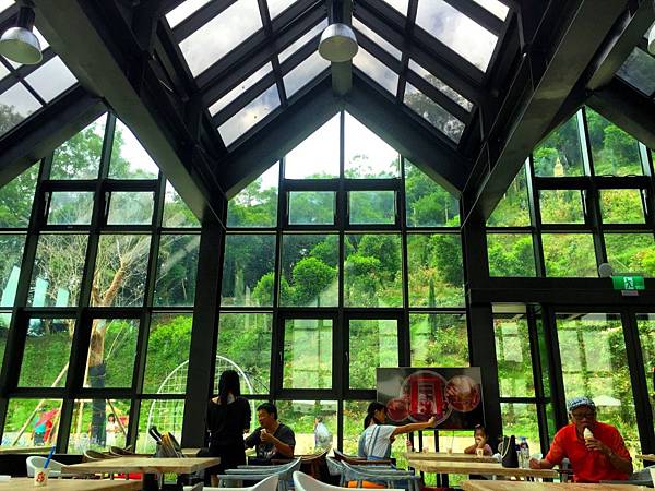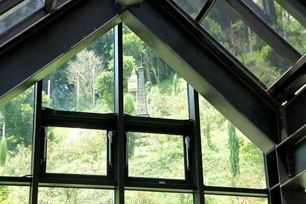 玻璃屋是用餐休息的地方,後面的山坡是世界玫瑰園