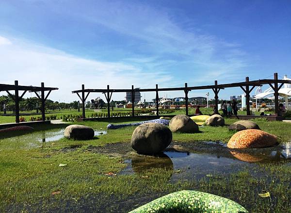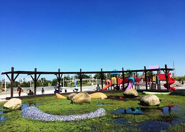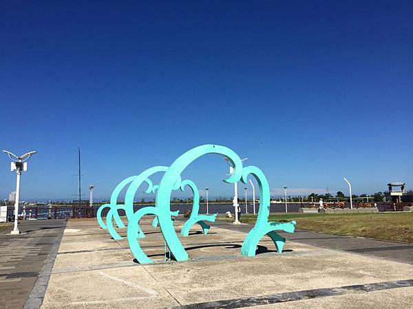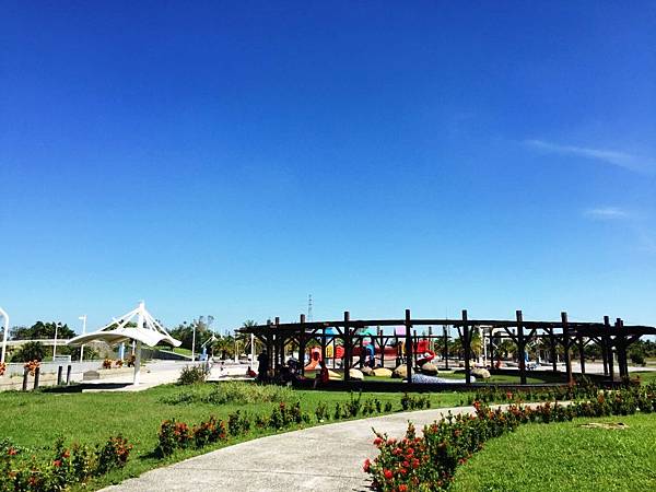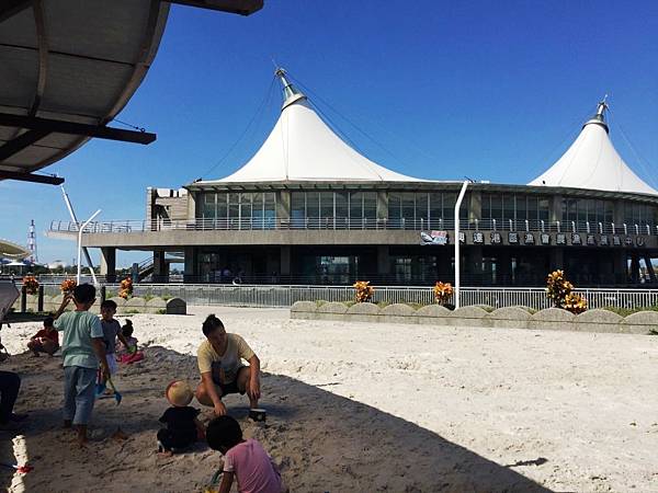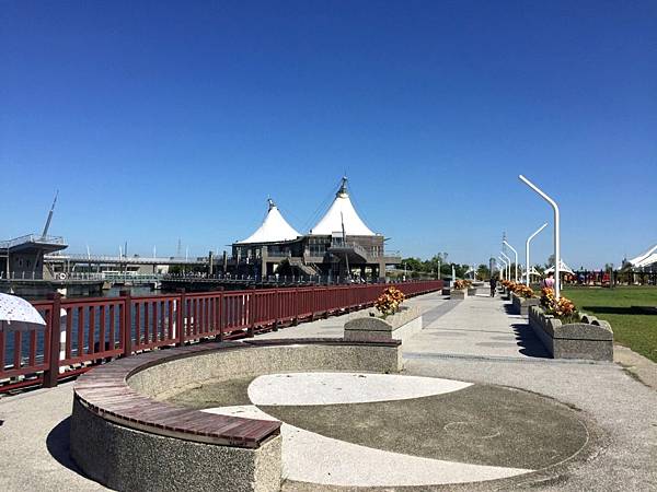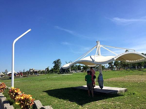 配合港灣的特色,設計出的薄膜風帆亭休憩區,讓園區搭配海景有著風帆點點的效果