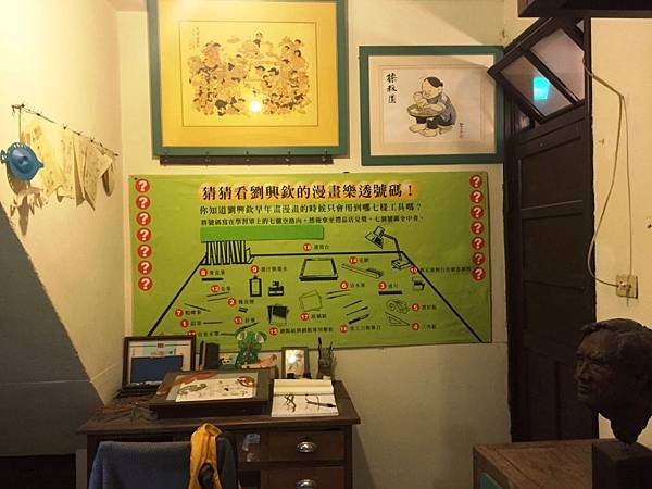 一小房間擺設營造劉興欽的工作室,牆上還有物品配置,可以看出老師在創作時運用哪些工具