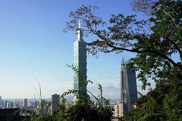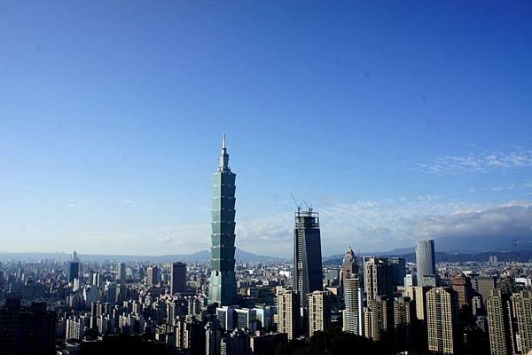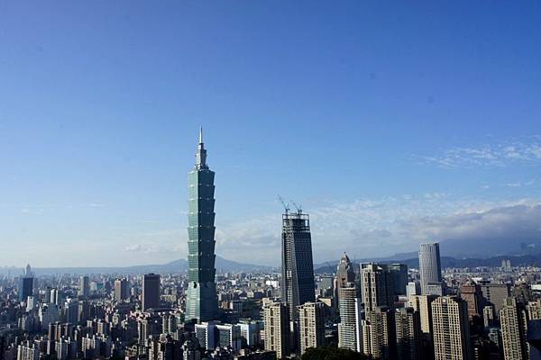 101大樓聳立於台北市區,背景則是襯著淡如山水畫的群山,在蔚藍的天空下,美麗宜人