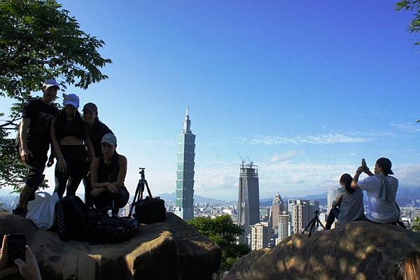攀爬登上巨石,熱鬧繁華的信義區和台北101大樓盡收眼底